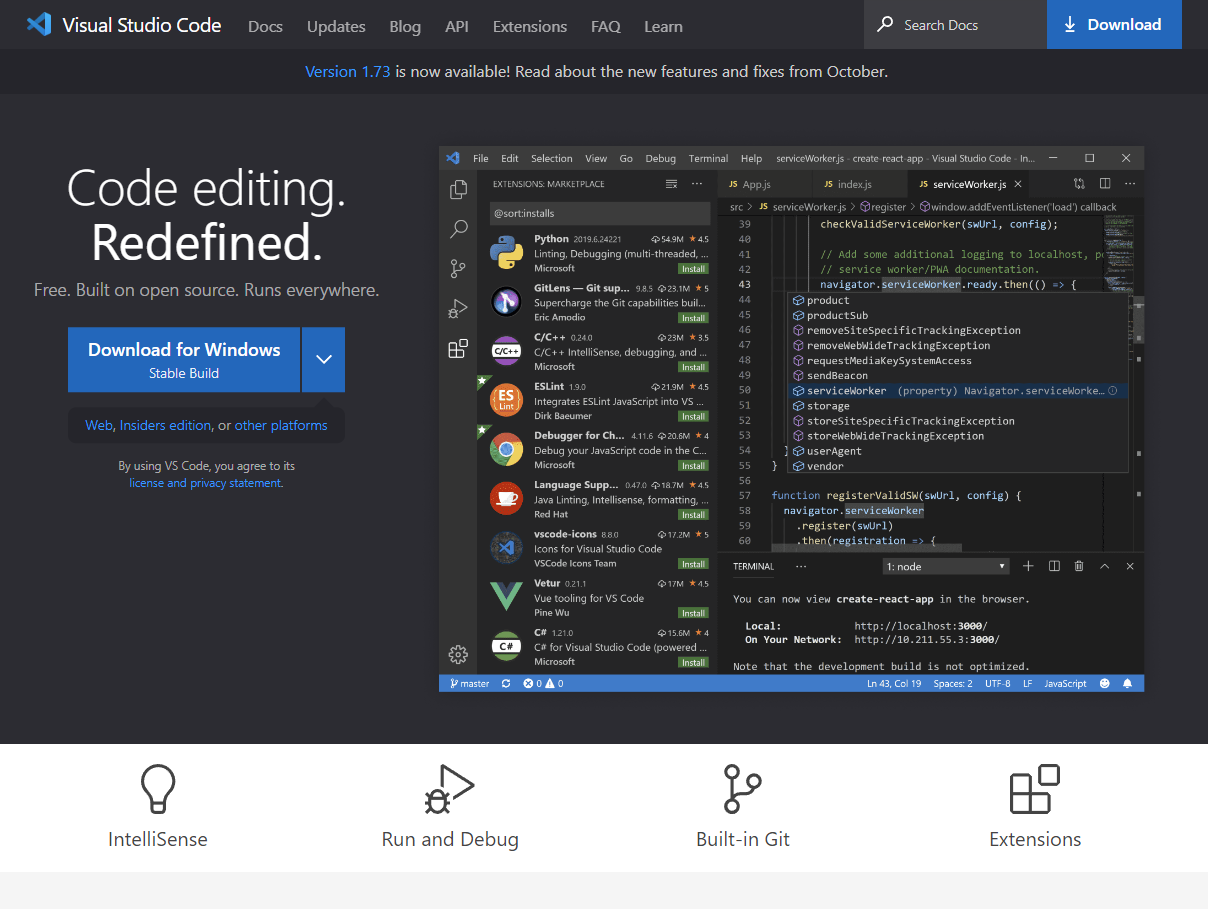 Visual Studio Code is a code editor redefined and optimized for building and debugging modern web and cloud applications. Visual Studio Code is free and available on your favorite platform - Linux, macOS, and Windows.