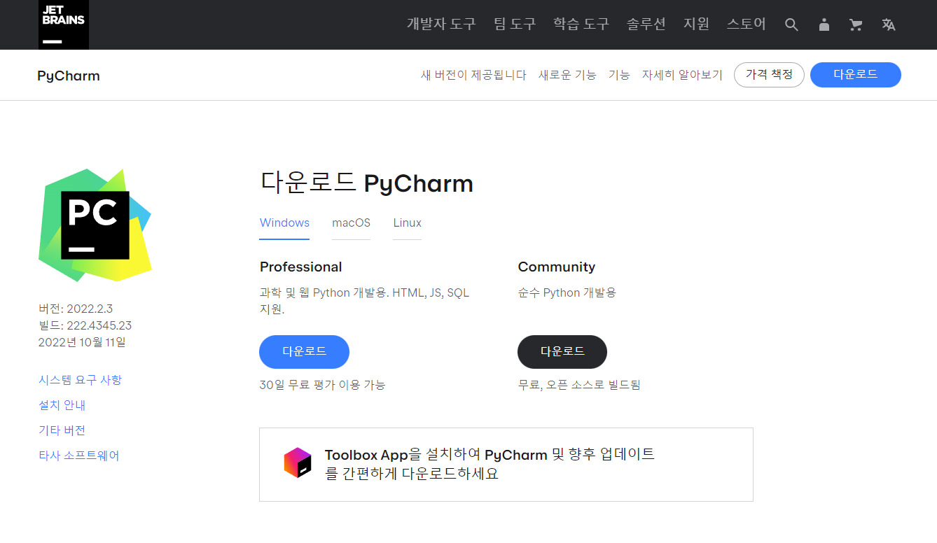 3. Pycharm : https://www.jetbrains.com/ko-kr/pycharm/download/#section=windows