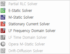 Low Frequency의 경우, 지원 Solver는 다음과 같이 E-Static Solver, M-Static Solver, Stationary Current Solver, LF Frequency Domain Solver 입니다.