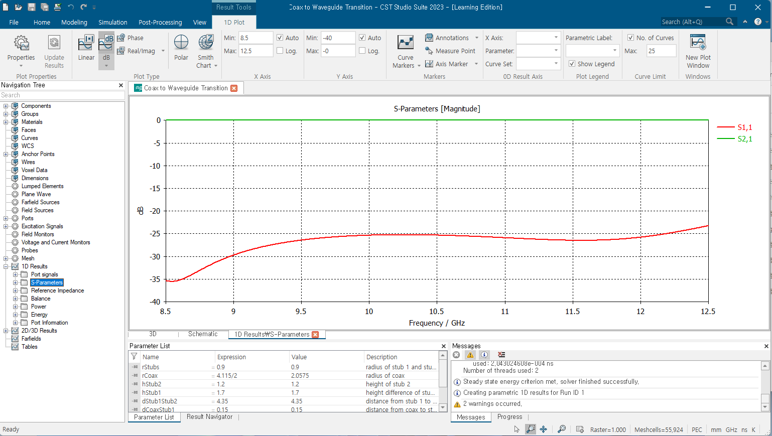 프로그램 내에 제공되는 예제를 불러와서 해석을 해 보았습니다. 첫 시도 결과는 실패했는데요. 그 이유는 mesh 수가 제한범위를 초과했다는 메시지나 나왔습니다. 도파관 구조 대칭 조건을 이용하면 mesh 수를 줄일 수 있을 것으로 보여 YZ면을 기준으로 대칭조건을 설정하고 해석을 해 보았고, 결과를 얻을 수 있었습니다.