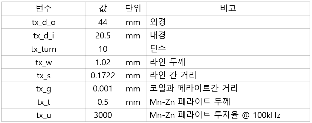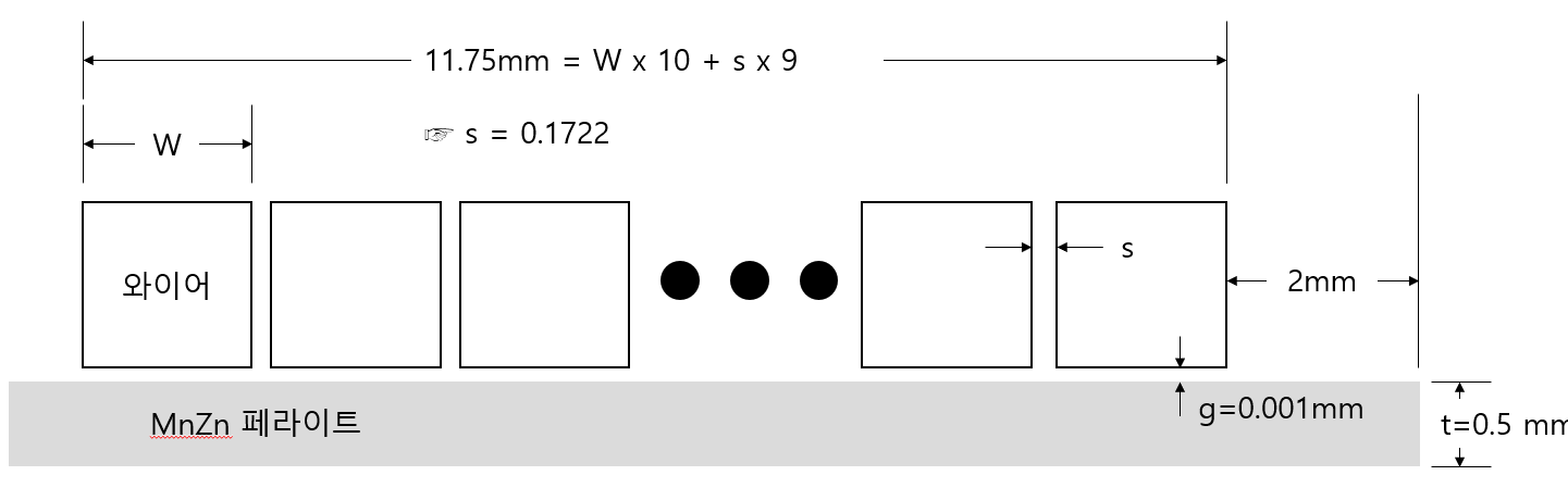 코일의 내경 20.5mm, 외경 44mm 구조를 감안하면 와이어간 간격을 대략 계산할 수 있다. 그리고 와이어와 페라이트간 절연이 필요하므로 물리적으로 0.001mm 거리를 둔다.