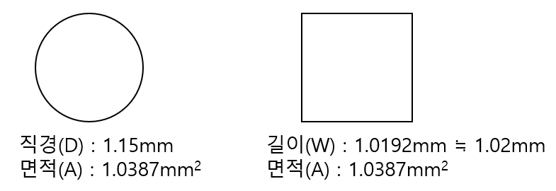 와이어는 통상 원형이나 해석을 간단하게 하기 위해서 정사각형 구조로 모델링한다. 이 경우 면적을 동일하게 하기 위해 폭을 계산한다. 요렇게 하는 것은 정확하지 않지만 모델링 쉽게 하고 해석시간을 단축시킬 수 있는 장점이 있다. 해석가능한 mesh수가 20,000개(테트라 메쉬)로 제한되어 있기 때문에 복잡한 구조는 해석이 안되니 참고 바란다.