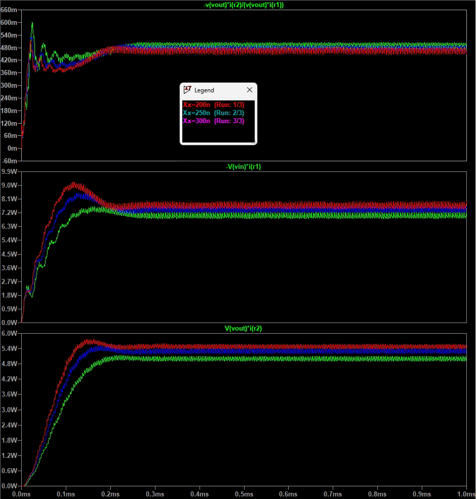 LTSPICE에서 사용할 수 있는 parameter sweep 기법을 소개한다. 아래 그림에서 C5에 '{XX}'를 입력하고 '.step param XX list 200n 250n 300n'을 입력하고 해석하면 C값이 200nF, 250nF, 300nF 순으로 해석하여 준다.