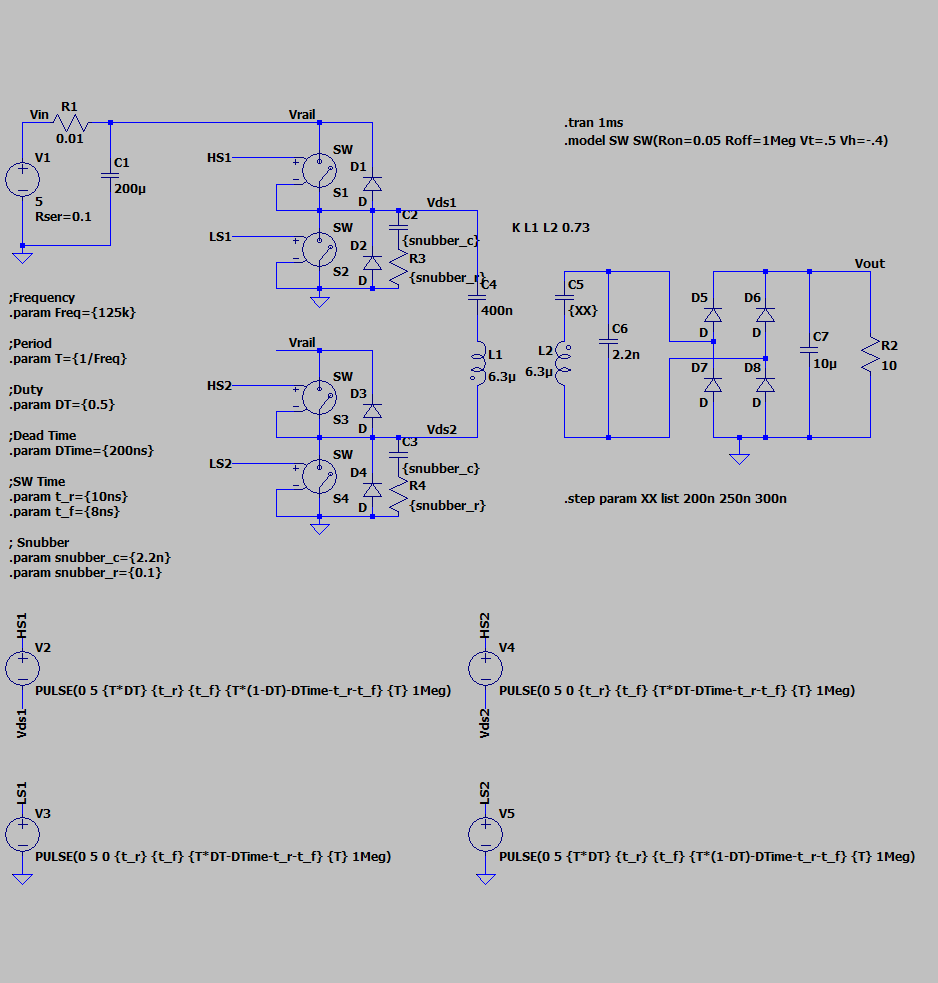 This section introduces the parameter sweep technique that can be used in LTSPICE. In the figure below, if you enter '{XX}' in C5 and enter '.step param XX list 200n 250n 300n', the C value is interpreted in the order of 200nF, 250nF, 300nF.