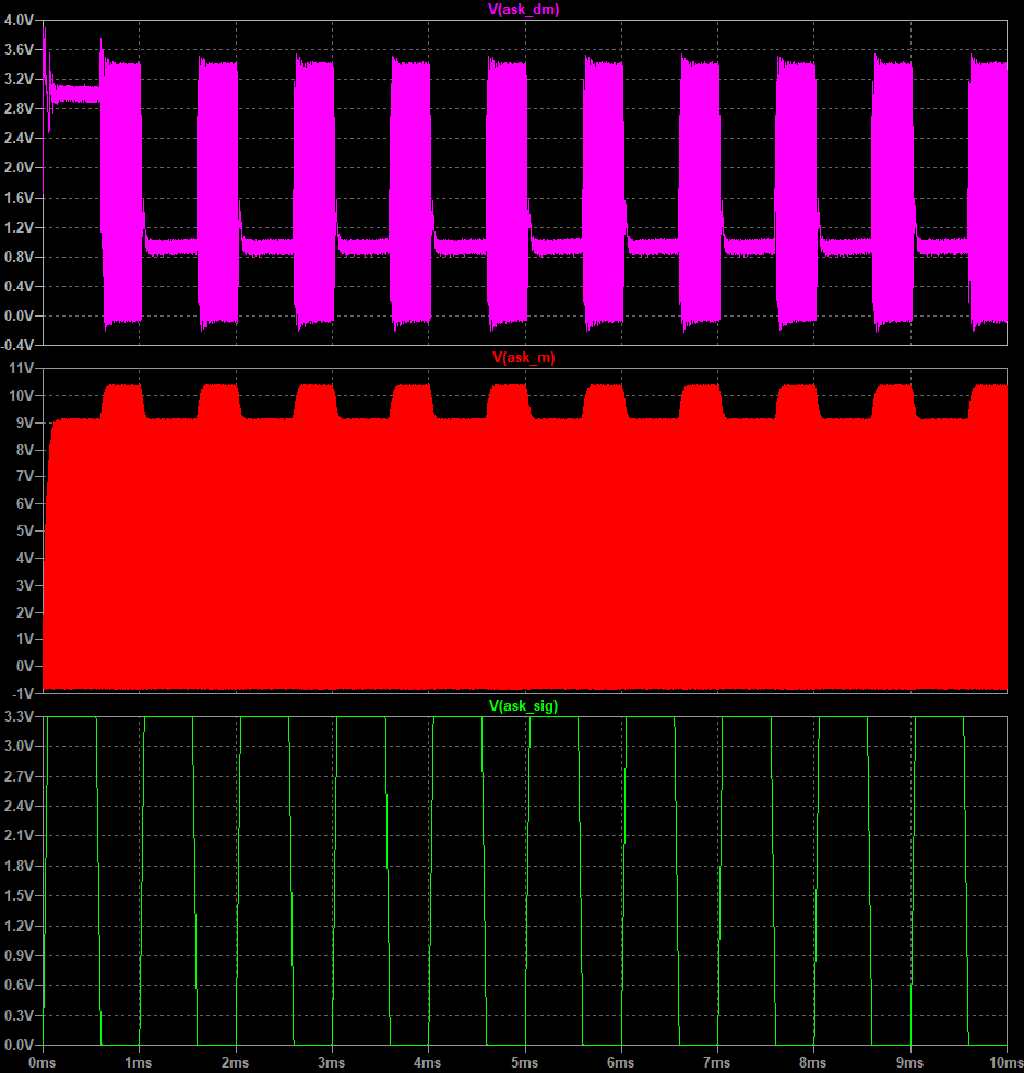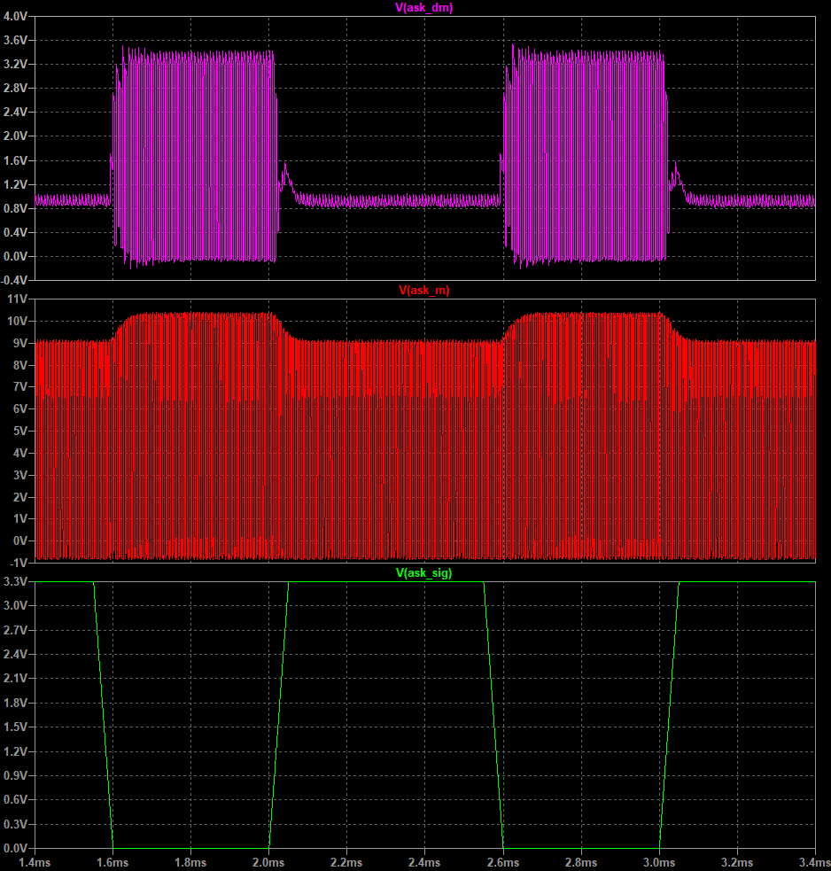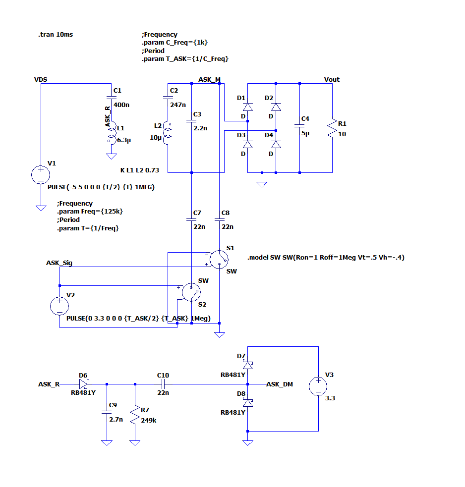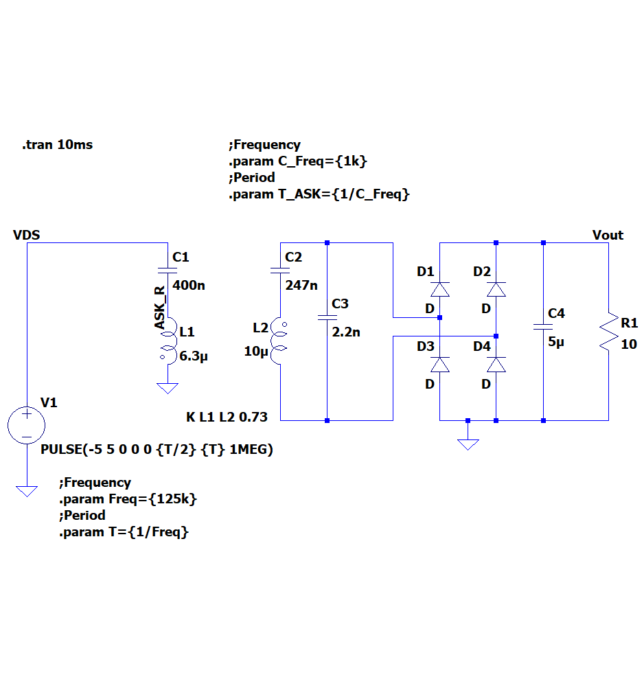 To create the ASK in the basic circuit, we can add a 22 nF cap to shake the load on the Rx and an on/off circuit. This on/off is controlled by the V2 voltage. The on/off frequency is 2 kHz, which produces 0s and 1s. The Tx recognizes a change in amplitude as a 1 and no change in amplitude as a 0. For more information, please refer to the standard documentation. If you add a change loop and a return loop to the basic circuit, it looks like this.
