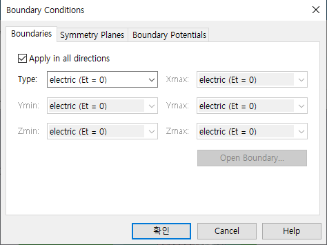 그리고 경계조건(Boundary Condition)을 Open에서 Electric으로 설정 도체로 설정 했다는 조건이다.