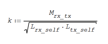해석 결과를 보면 각 코일의 자기 인덕턴스(Self Inductance)와 상호 인덕턴스(Mutual Inductance)를 얻을 수 있다. 결합계수는 다음의 관계식으로 얻을 수 있다.