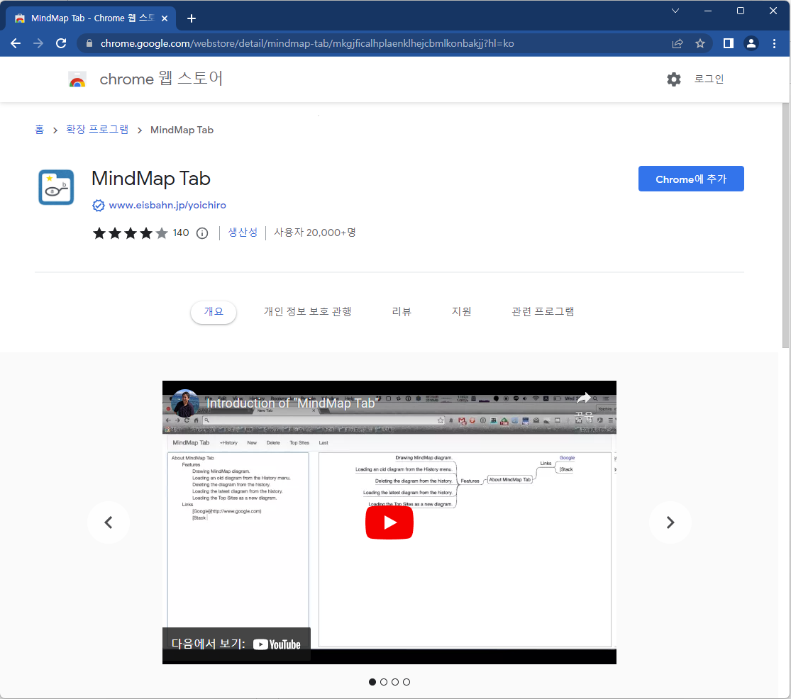 프로그램은 구글 크롬에서 크롭 웹 스토어를 통해서 MindMap Tab을 검색하면 찾을 수 있다.