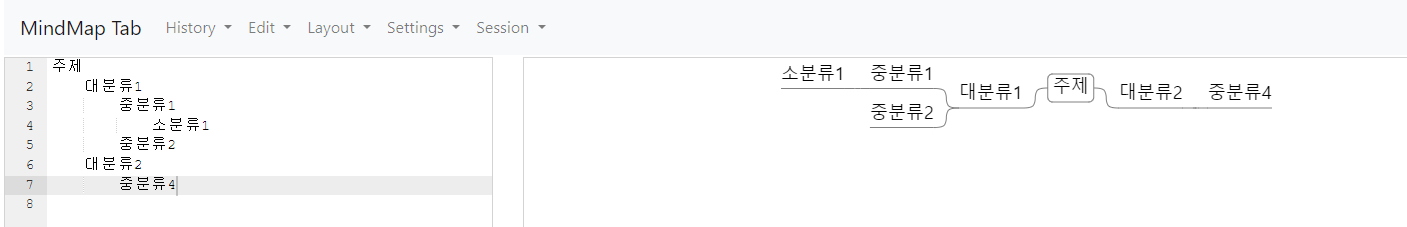좌측에 글을 타이핑하면 된다. 다음행에서 탭 정도를 가지고 단계를 조정할 수 있다. 레이아웃이 좌우, 우측, 하단 등 간단한 것만 지원하지만 빠르게 정리할 수 있는 장점이 있어서 활용도가 높을 것이라는 생각이 들었다. 즉 텍스트 입력만으로만으로 마인드맵을 구성할 수 있다. 아쉬운 점은 OS 제약 없이 구글 크롬이 있다면 모두 동작하지 않을까 생각했지만 윈도우 계열의 구글 크롬에서만 사용 가능했다.