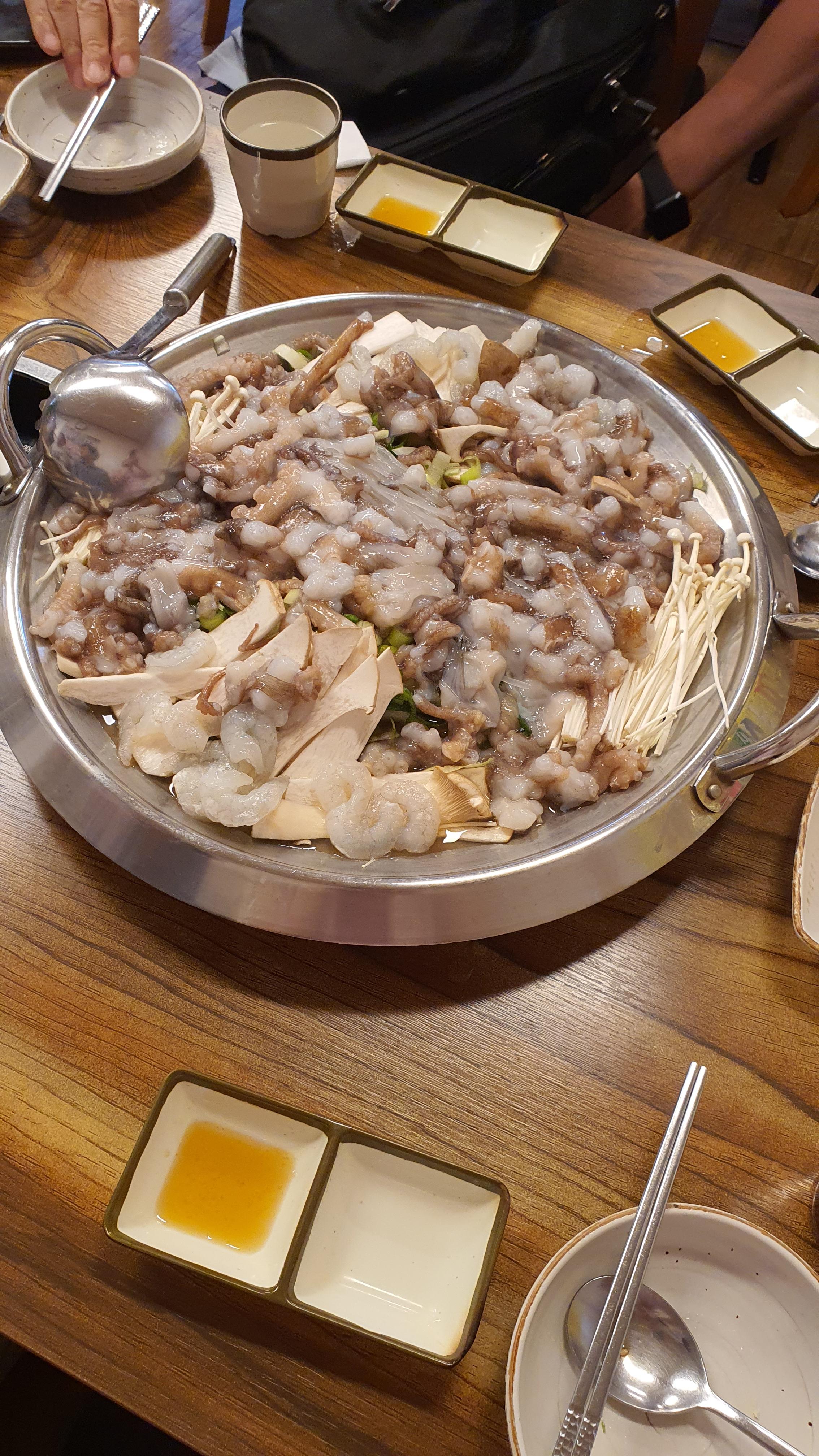 나는 술을 마실 수 있는 상황이 아니어서 탄산음료에 산낙곱새를 즐겼다. 낙지는 살짝 익히니 아주 쫄깃하였고, 반찬들도 비면 리필을 해 준다. 장거리 운전을 해서 컨디션이 별로 좋지 않은 상태였는데 낙지를 먹으니 조금 기운이 나는 것 같았다.