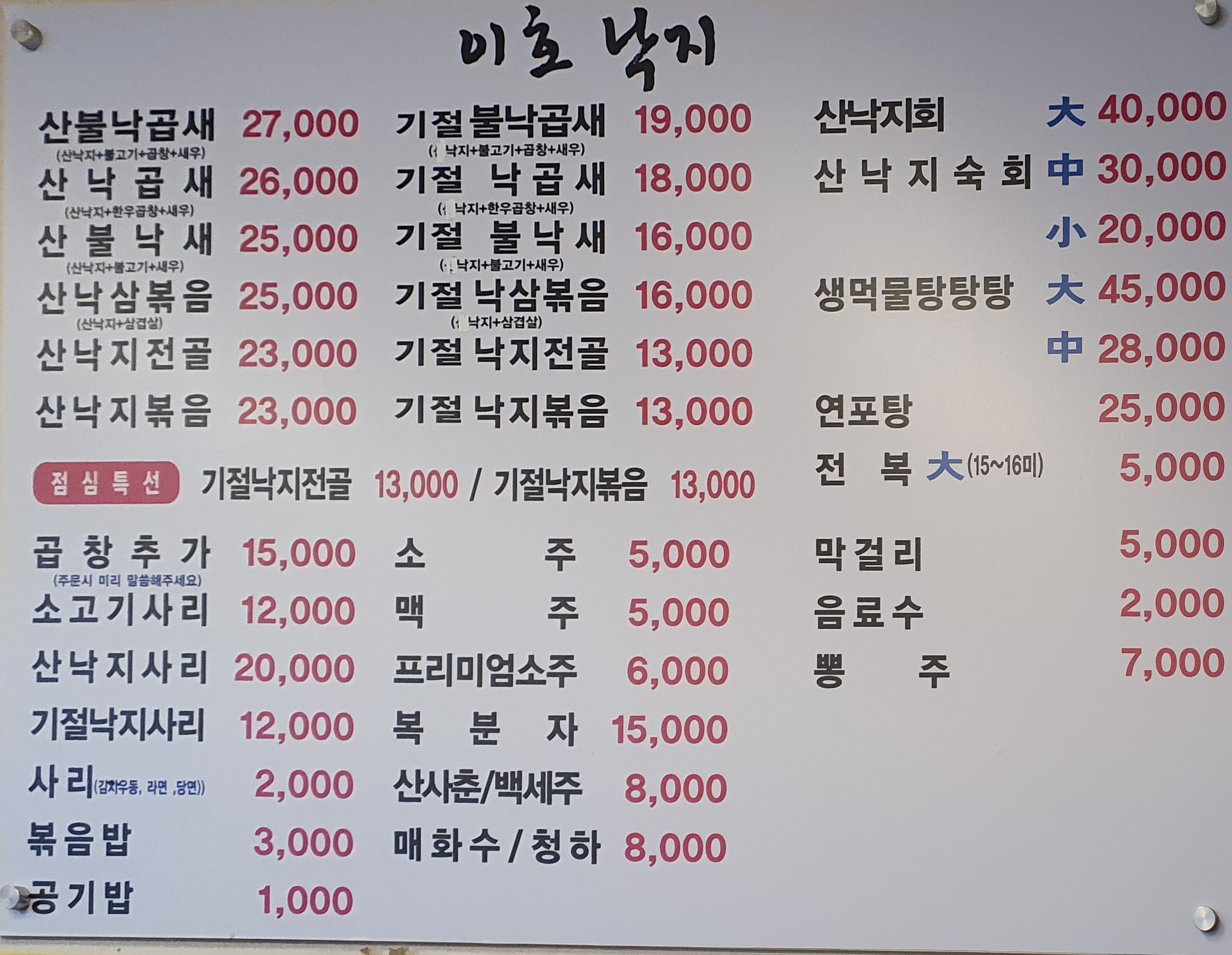 주문 메뉴는 산낙곱새이고, 술은 기본 소맥에서 출발해서 소주로 가고, 술을 못마시거나 마시지 못하는 사유가 있는 사람들은 탄산음료로 대체하였다. 오늘을 따라 손님이 많은 것인지는 모르겠지만 암튼 홀과 룸에 손님들이 자리를 채우고 있었고 대화하기 어려울 정도로 시끌버쩍하다.