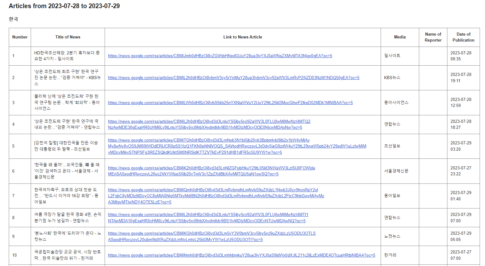 │ 번호 │ 뉴스 제목 │ 뉴스 기사 링크 │언론사 │ 기자이름 │ 발행일 │